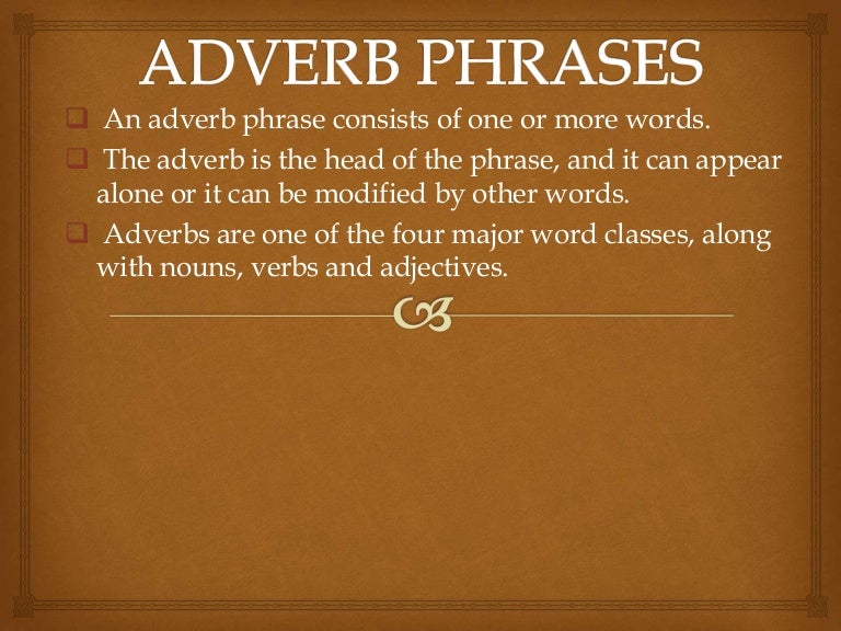 Adjective phrases from image.slidesharecdn.com Adverb phrase, prepositional phrase, verb phrase, and noun clause. Adjective and adverb phrases draft. Adverbs and adverb phrases often function as adjective phrase modifiers in english. The fabrics from the orient were quite beautiful. Adverb phrases typically answer the questions how, where, why or when something was done, as you'll see in the adverb phrase examples below. Modifies the noun changes, telling what kind.] a prepositional phrase that modifies a verb, an adjective, or an adverb is called an adverb. The adjective phrase can be placed before or after the noun or pronoun in the sentence. For example, the adjective phrase too loud in the sentence he plays his music too loud functions as verb phrase modifier.